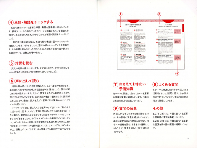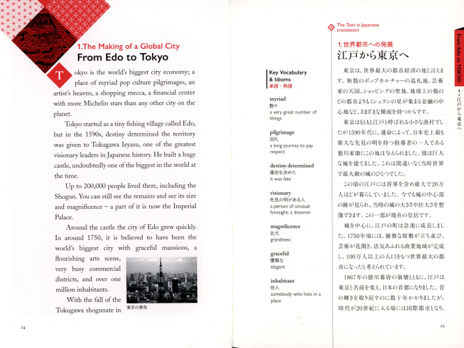 It takes globally famous Japanese cultures, manga, movies, sport, history, food etc. and introduces related and fascinating topics, AND the words to help you explain them and make friends with foreign people who want to know more about Japan.
